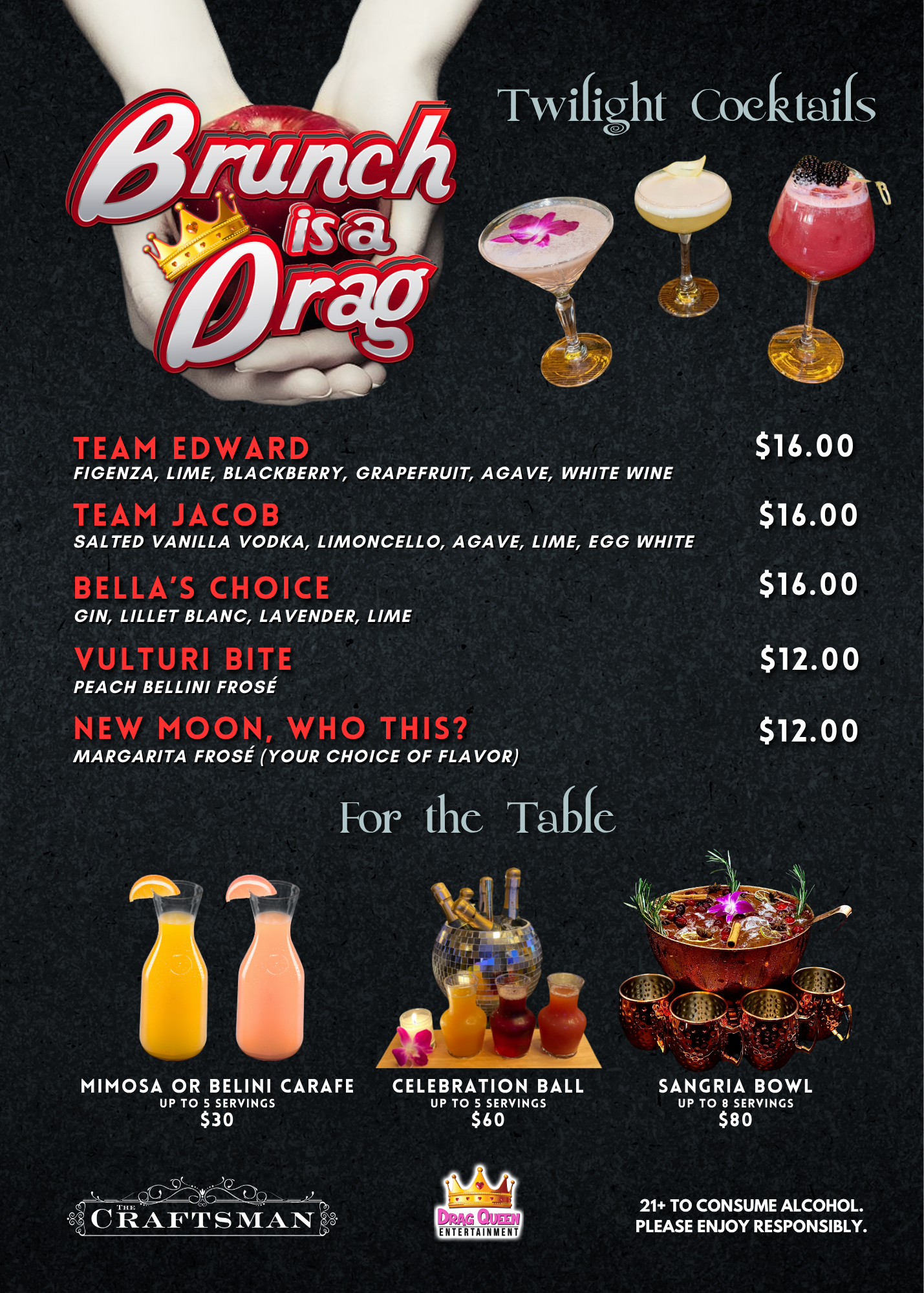 On Saturday, April 4th, step into the shadows at The Craftsman in Fair Lawn, NJ for a dangerously fabulous Twilight-Themed Drag Brunch!