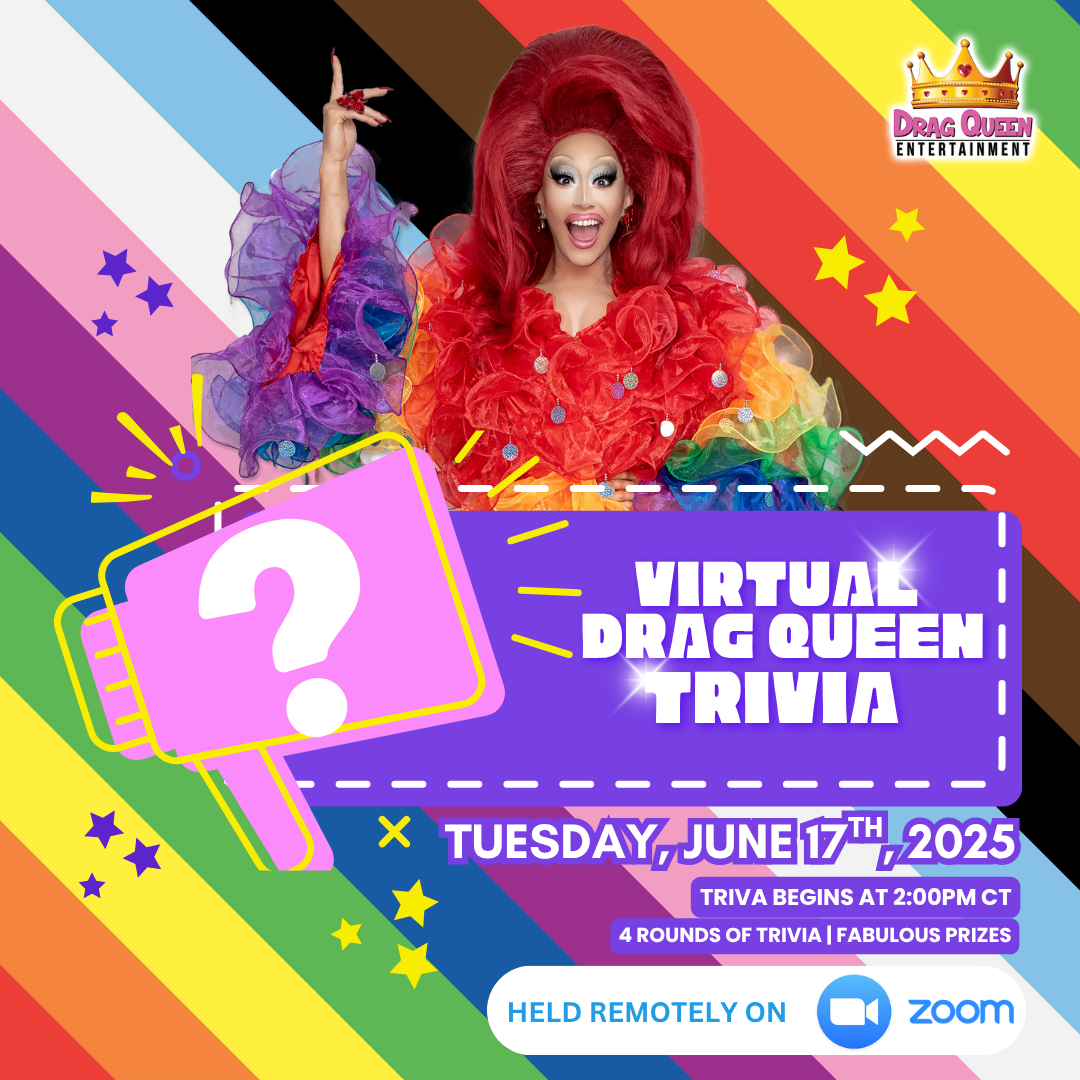 On Tuesday, June 17th., Join our Drag Queen Sensation for Virtual Drag Queen Trivia held remotely via Zoom! Join your friends and colleagues for FOUR fun and competitive rounds of TRIVIA and the chance to win exciting prizes! Our Drag Queen Hostess will be spicing things up and getting the fun started with a few of her favorite performances between rounds of Trivia!